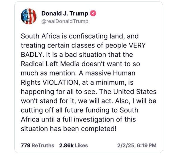 On February 2, at 6:19 p.m., Trump took to Truth Social, asserting that “South Africa is confiscating land and treating certain classes of people VERY BADLY.” He declared, “I will cut off all future funding to South Africa until a full investigation of this situation is completed!” This incendiary statement set the stage for dramatic escalation.