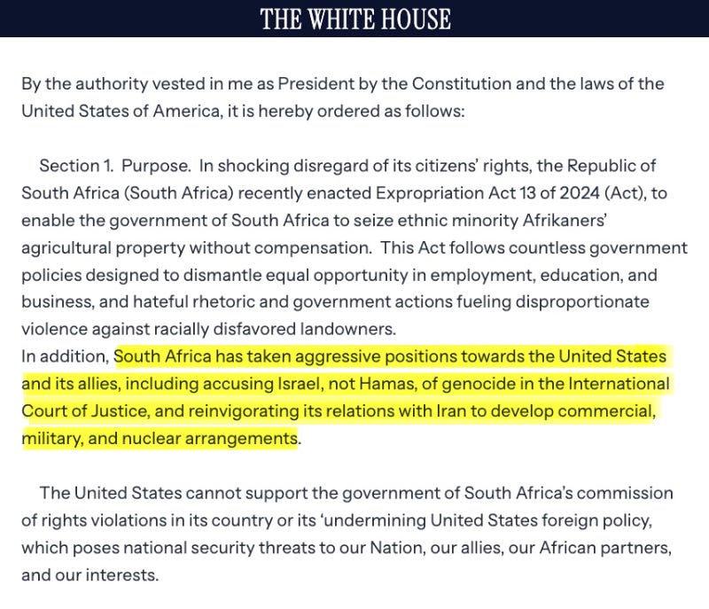 Secondly, it is naive not to see that ordinary South Africans are now being punished for the country’s actions against Israel in the ICJ case. The Executive Order clearly states that the withdrawal of aid is linked to the “unjust and immoral practices that harm” the U.S. and its allies via the ICJ case. The Executive Order specifically notes that “South Africa has taken aggressive positions towards the United States and its allies, including accusing Israel, not Hamas, of genocide in the International Court of Justice, and reinvigorating its relations with Iran”.